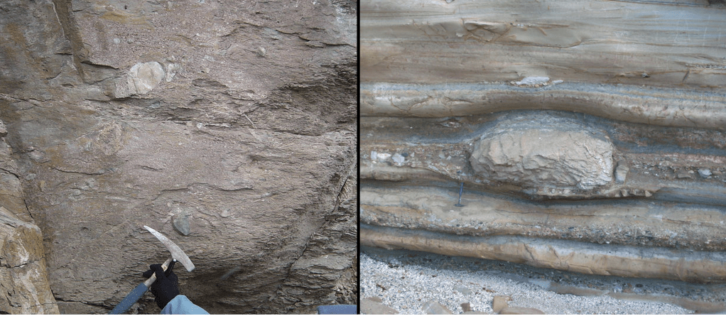 Left: A Late Proterozoic diamictite, a jumble of poorly-sorted sediment of varying sizes. Structures like these are often interpreted as sediment deposited by glacial activity. Image by Qfl247, CC BY-SA 3.0