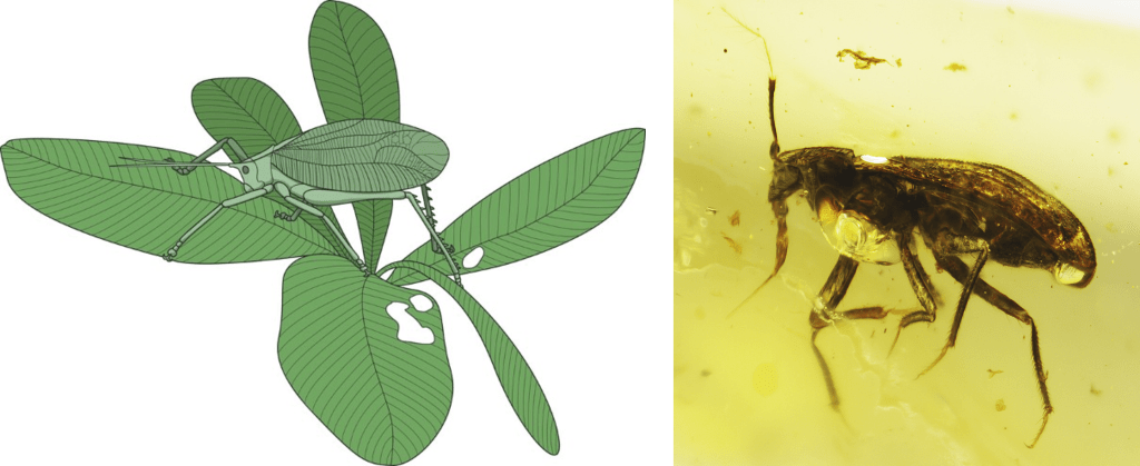 Left: Artist’s reconstruction of Permotettigonia gallica, a leaf-mimicking katydid from the Permian Period, an example of ancient masquerade. Image by Garrouste et al. 2016.