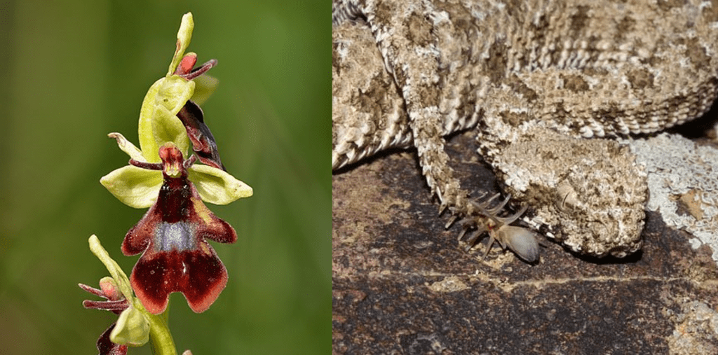 Left: A fly orchid’s flower resembles an insect and exudes chemicals similar to insect pheromones. These features attract pollinators. Image by Ivar Leidus, CC BY-SA 4.0