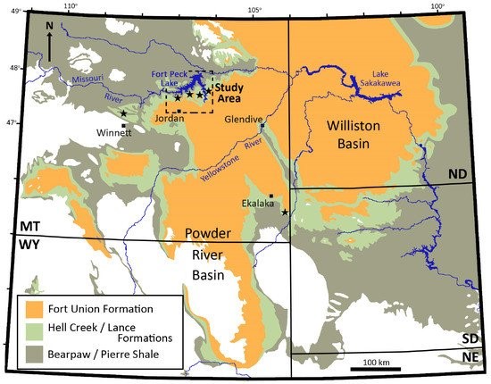 The Hell Creek Formation mostly consists of siltstones, mudstones, and sandstones that represent an ancient flat plain crossed by many rivers. These rivers ran west to east, originating from the early Rocky Mountains to the west and emptying into the Western Interior Seaway in the east. The finer sediments were generally deposited on the floodplain during high water levels, and sandstone channels mark the positions of the ancient rivers themselves.