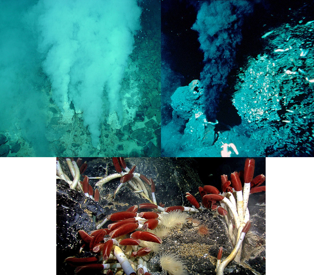 Depending on their mineral content, hydrothermal vents can be white smokers (top left) or black smokers (top right), and they can support everything from microbial life to colonies of large tubeworms (bottom).