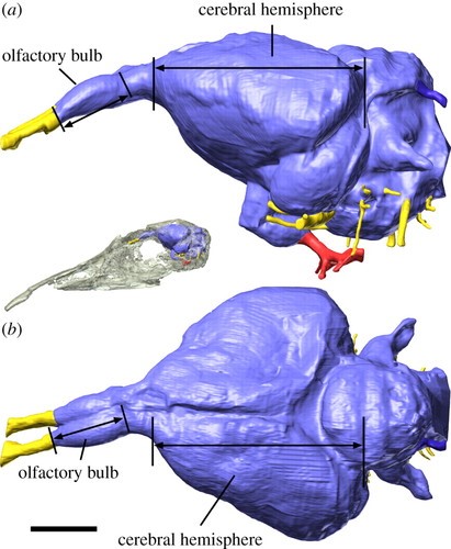 It can be difficult to determine the smelling capabilities of a fossil animal, since most of the smelling apparatus does not fossilize well, but some clues do exist. Paleontologists can measure the size and dimensions of a fossil animal’s nasal cavity – the larger the space, the more room for diverse scent receptors, the more likely a powerful sense of smell. Similarly, given a fossil skull with a well-preserved braincase, paleontologists can measure the size of the olfactory bulb of the brain, which is also generally larger in more skilled smellers. Such fossil evidence has been used to interpret smelling ability in early mammals, ancient birds, and a variety of other dinosaurs. Some fossil animals, like tyrannosaurs, are thought to have had excellent senses of smell.