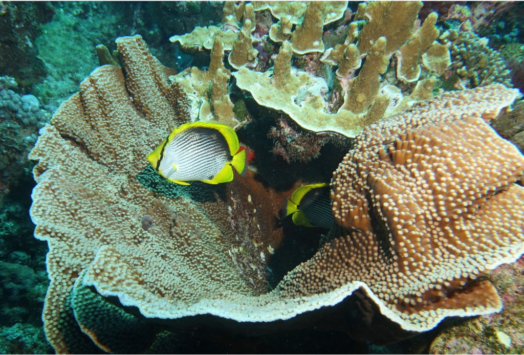 A symbiotic scene. These butterflyfish are using coral for shelter, while the coral itself is home to microscopic photosynthetic algae which find shelter in the coral’s cells while also providing energy for the coral to grow. The fish, in turn, are hosts to their own internal microbes and parasites (some of which have their OWN internal microbes and parasites). Symbiosis all the way down.