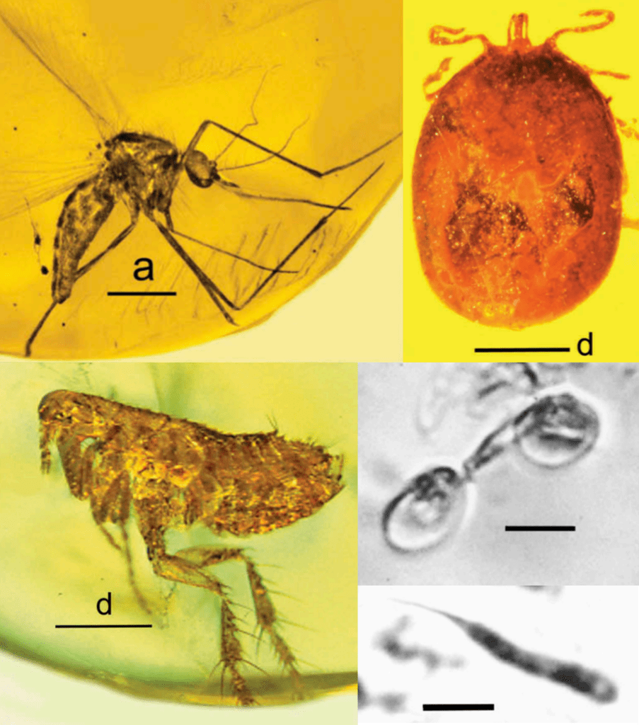 Bottom right: Two images of parasites found within a sandfly in Myanmar amber, Cretaceous. The two images depict different life stages of a parasite closely related to modern parasites that cause leishmaniasis.