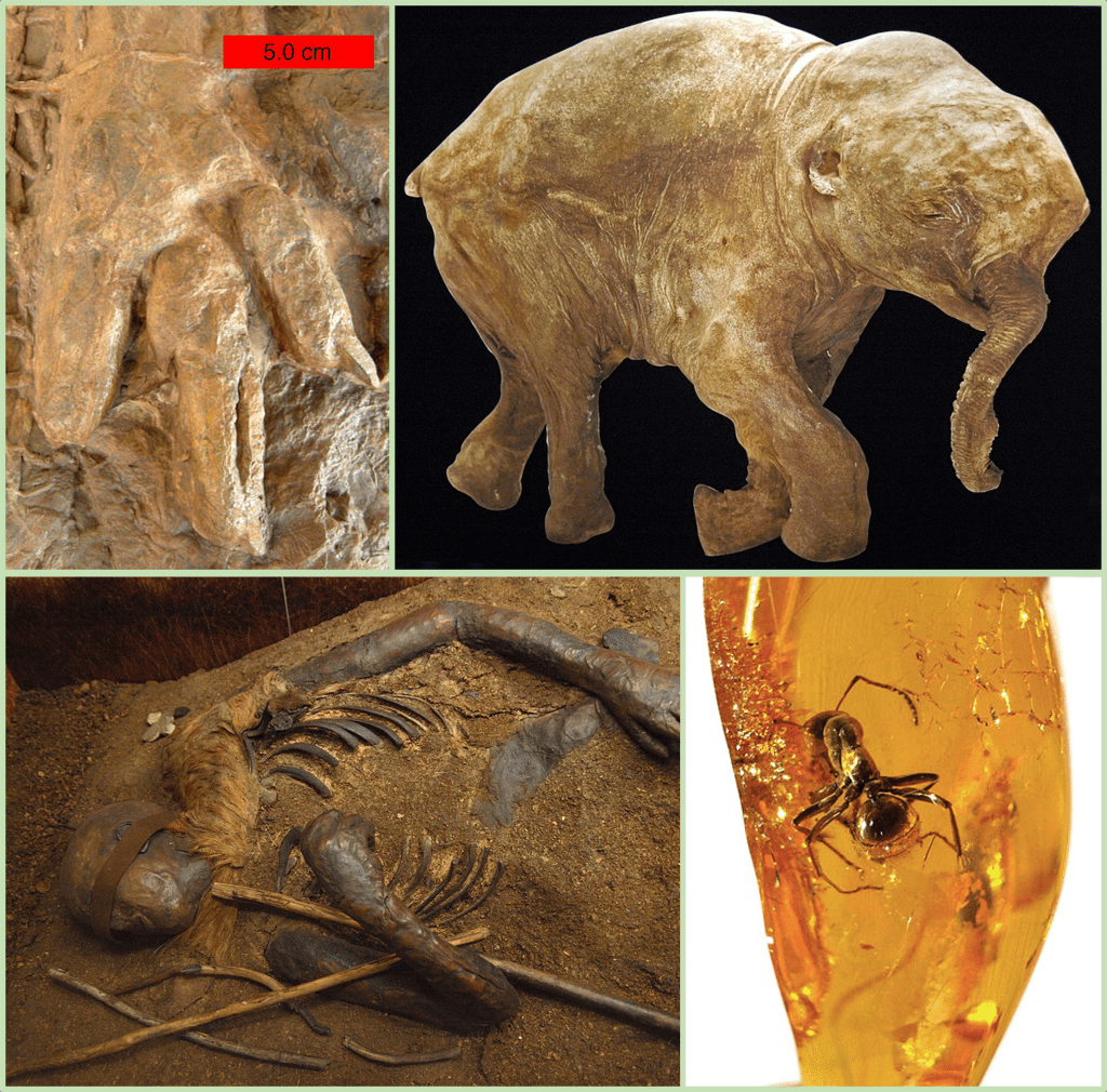 There are other forms of fossilization, of course, besides the typical Burial + Petrification. Trace fossils can preserve evidence of behavior, though they can be highly varied and difficult to interpret. Ice can preserve entire bodies, soft tissue and all, and even DNA, but generally only captures life over the last few tens of thousands of years. Bog bodies are also great for soft tissue, but bad for DNA, and again, only preserve recent things. Amber is a fantastic source of soft tissue information, but usually only preserves small-bodied organisms.