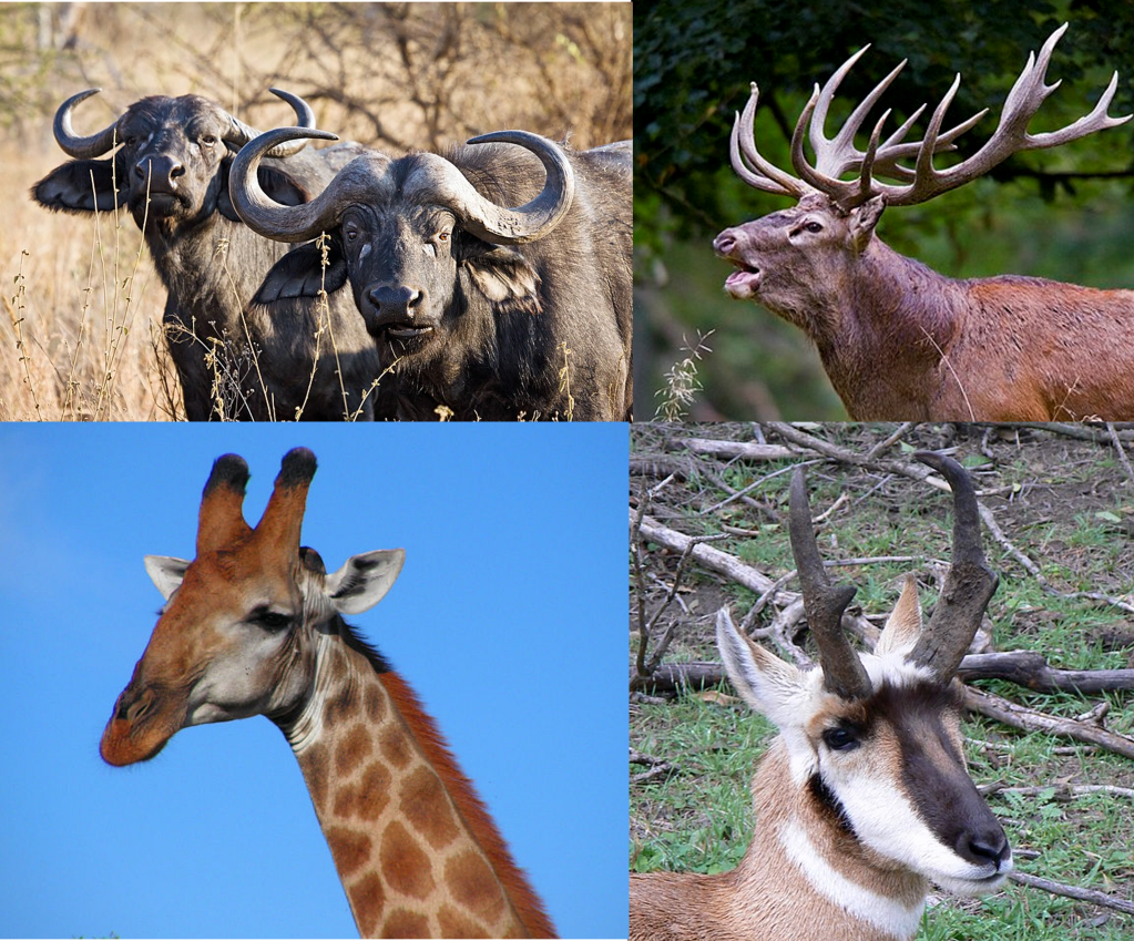Bottom right: Pronghorns, which are found on antilocarpids (also known as … pronghorns) have a bony core with a branching keratin sheath which sheds each year. Image by Mongo, Public Domain.