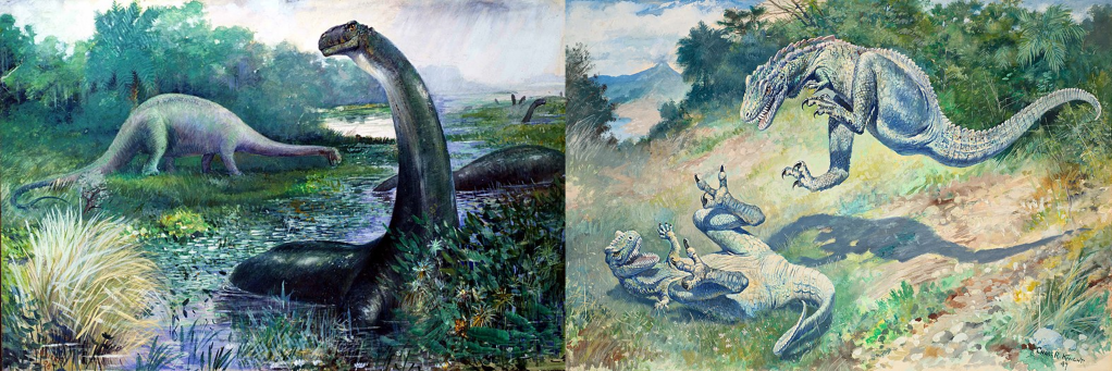 In 1894, he was asked for the first time to use his talents to imagine an animal known only from bones, a pig-like entelodont. He did such a good job that he was soon commissioned as artist and consultant for a redesign of the paleontology exhibits at the American Museum of Natural History in Manhattan, NY. These exhibits were among the first attempts to create informative paleontology displays for a public audience, and the murals Knight created would go on to be some of the most famous pieces of paleoart ever made.