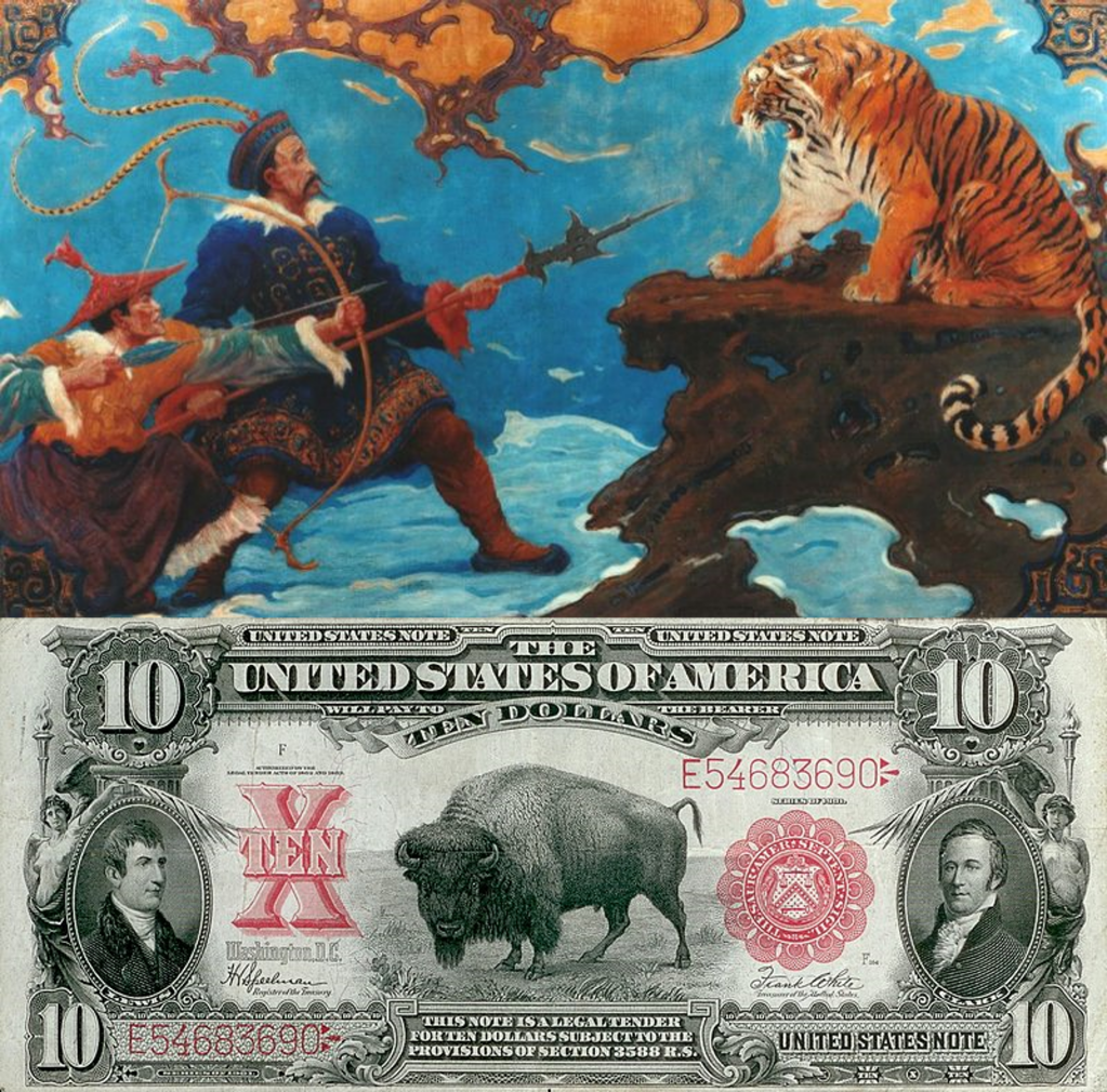 Bottom: This 10-dollar bill, issued in 1901, features Knight’s artwork of a bison.
