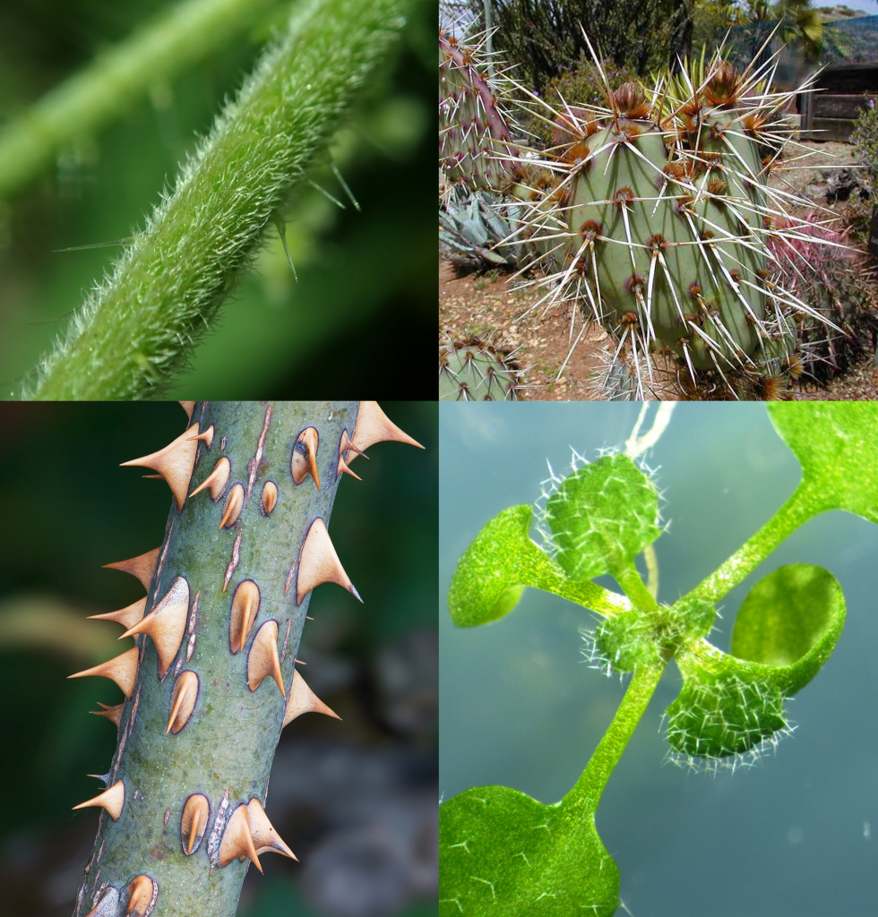 Bottom left: The prickles (modified epidermis) of a rose. Image by JJ Harrison, CC BY-SA 3.0