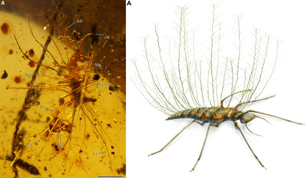 Left: A preserved larva. Right: Artist’s reconstruction of the “naked” (no debris) larva.
