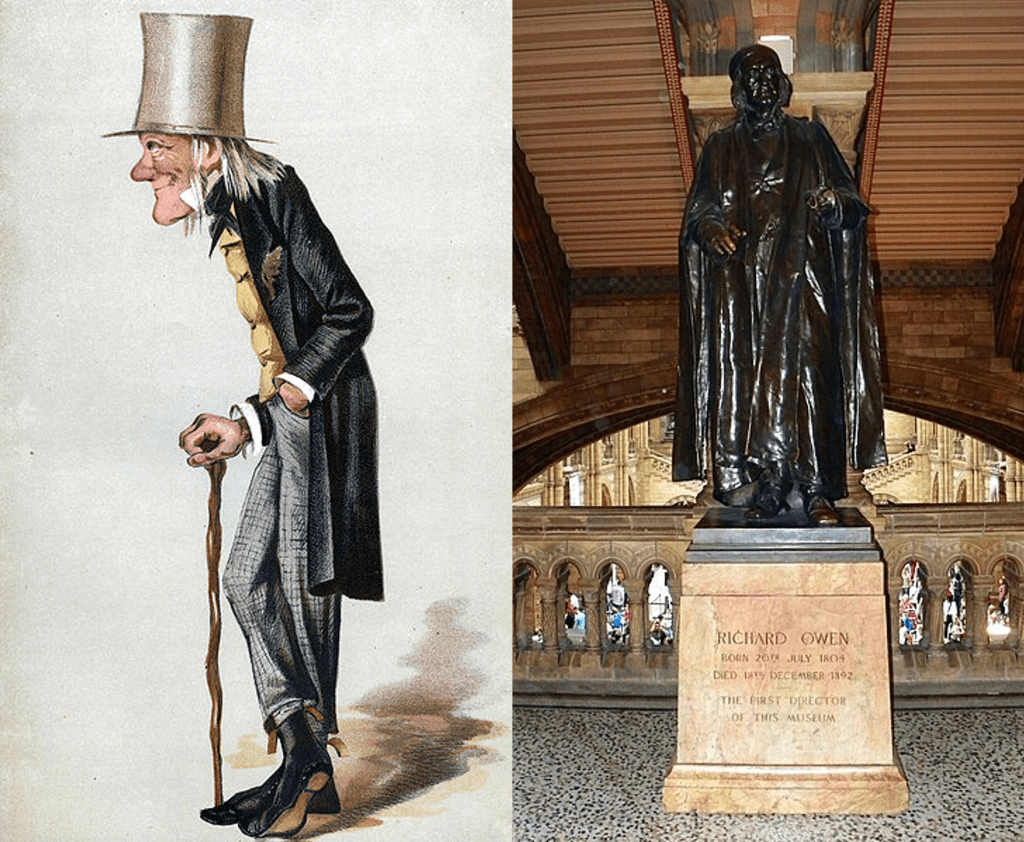 Right: Commemorative statue of Owen in the Natural History Museum, London, 2012. Image by AnemoneProjectors, CC BY-SA 2.0