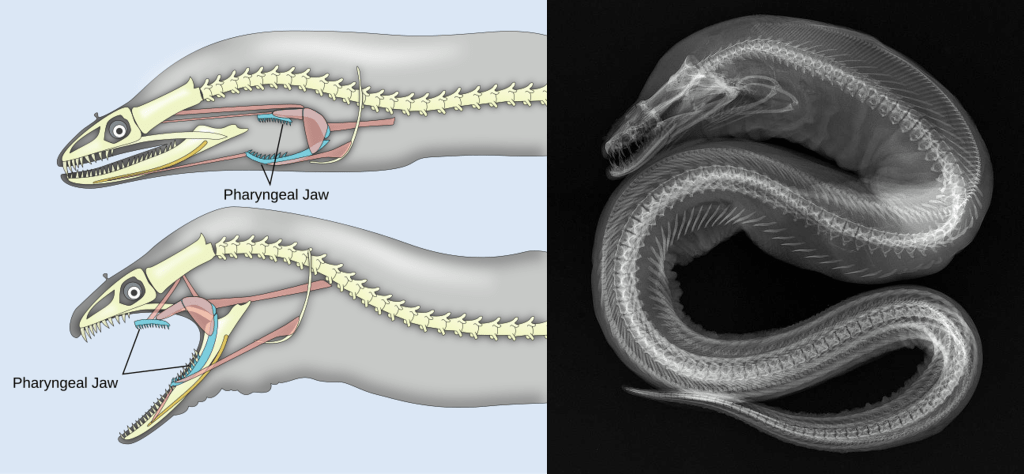 One famous and unusual feature found in eels is the set of pharyngeal jaws seen in morays. In these species, gill arches have been modified into a mobile “second set” of jaws that work in concert with the main jaws during feeding.