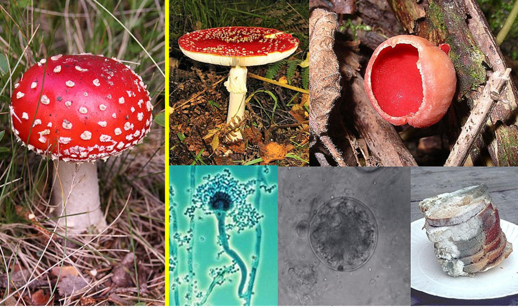Right: Collage of fungi, including a fly agaric mushroom, a scarlet cup, Aspergillus, a chytrid, and some mold growing on bread. Image by BorgQueen, CC BY-SA 2.5