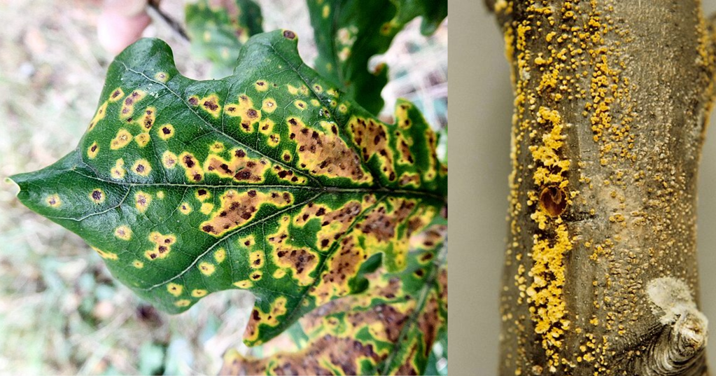Right: Chestnut blight on a chestnut tree. Image by Joseph O’Brien, CC BY 3.0