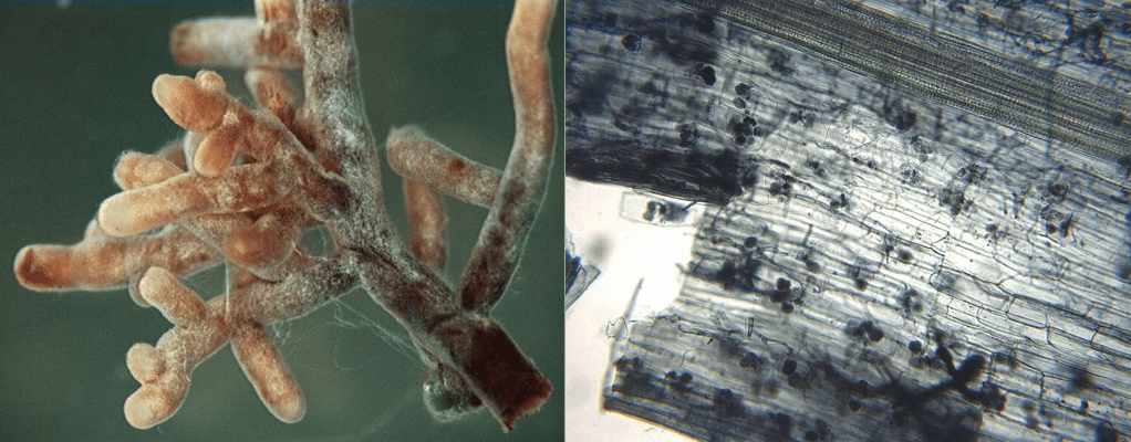 Right: Microscope image of arbuscular mycorrhizae within plant root cells. Image by MS Turmel, Public Domain