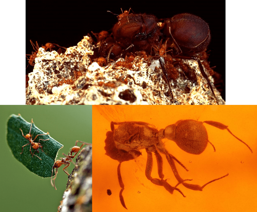 Bottom right: Fossil fungus-growing ant (genus Atta) in Dominican amber. Image by Christopher Johnson, Public Domain