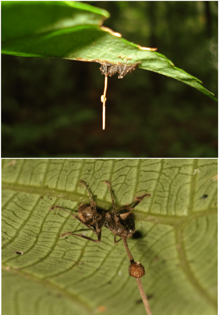 Among the most dramatic examples are fungal parasites of arthropods, some of which end up completely overtaking the body of their hosts. Some species grow fruiting bodies directly out of the carcass of their host once it’s dead, while others – like the famous fungal parasites of cicadas – shed spores as their host flies around infecting others. And of course there are the famous Ophiocordyceps fungi that infect ants, force them to crawl up to a high location, and then sprout out of their bodies to drop spores on the rest of the colony.