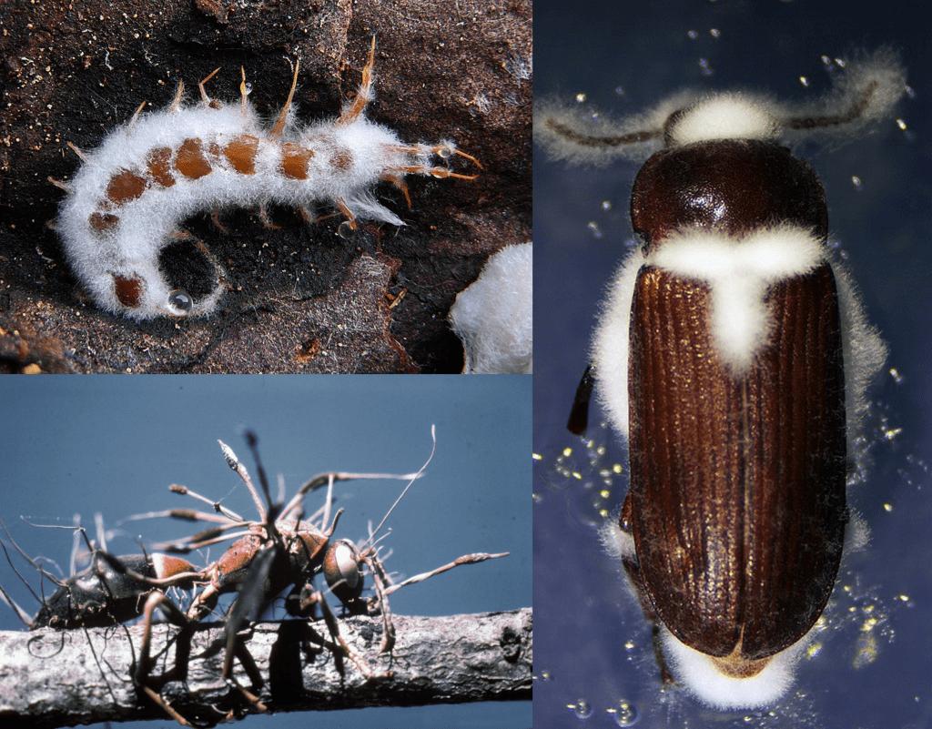 Right: Beauveria bassiana parasite emerging from a mealworm. Image by Preisegger et al 2023, CC BY-SA 4.0