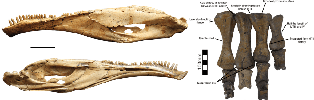 Left: The lower jaw of Erlikosaurus, with blunt rounded teeth and a down-turned end, similar to other herbivorous dinosaurs. Image from Zanno et al 2016