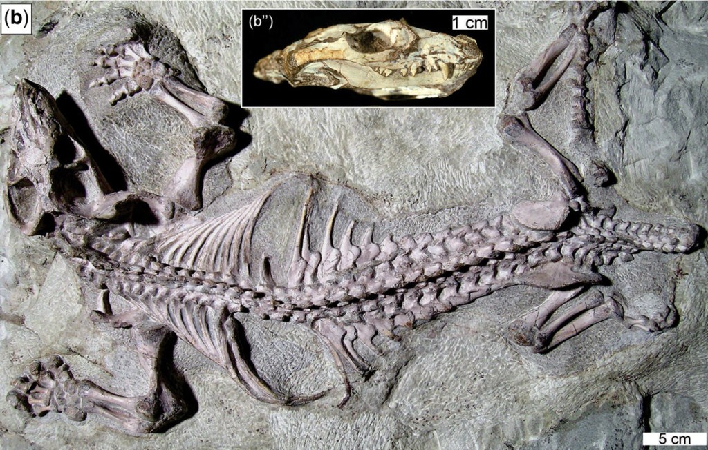 The skeleton belongs to Galesaurus, and the inset skull belongs to Thrinaxodon. Image from Bordy et al 2023