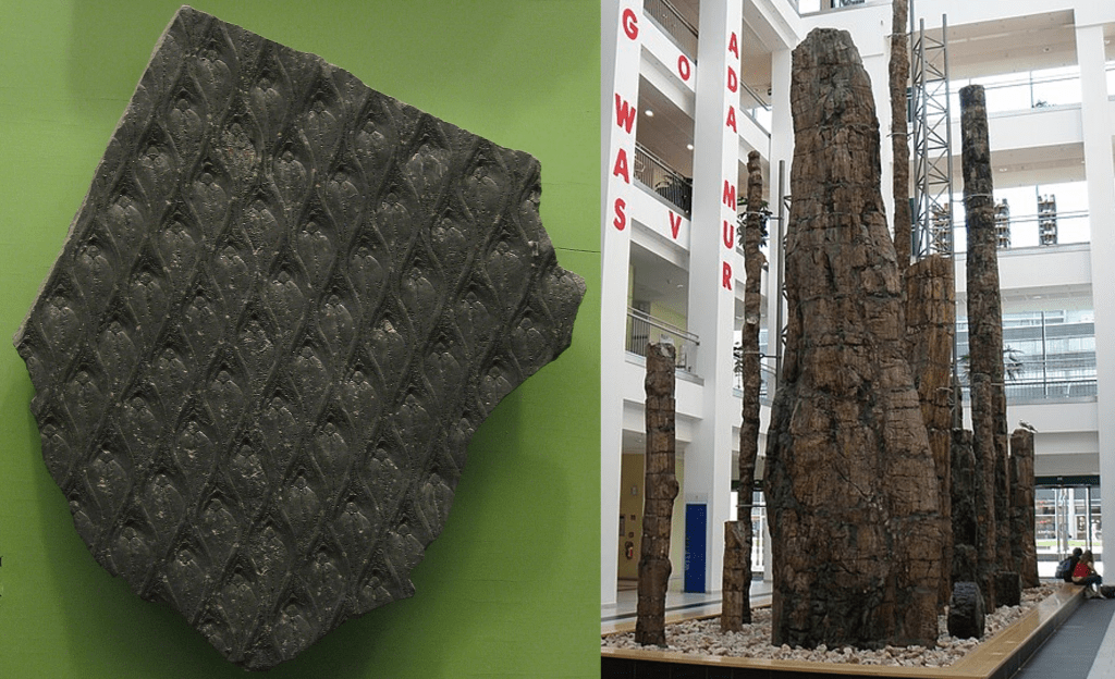 Right: Petrified trunks of ancient giant horsetails. Image by Sgeureka.