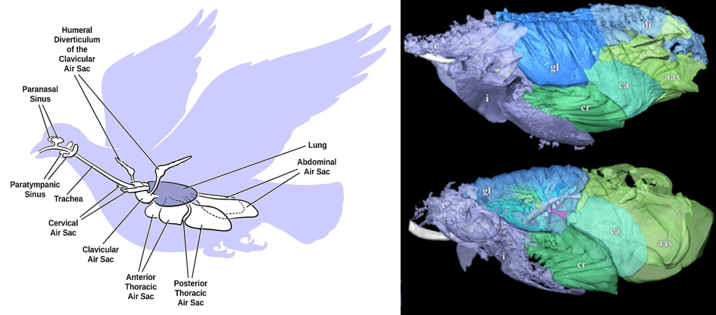 Lung anatomy can vary quite a bit. Many reptiles and amphibians have simpler lungs with fewer internal divisions. Birds have a famously complex respiratory system where their lungs are supplemented by a series of air sacs that sit beside and inside their bones; as they breathe, air moves in and out of these air sacs in a pattern that reduces the mixing of new air and old air, giving them a very efficient respiratory system.