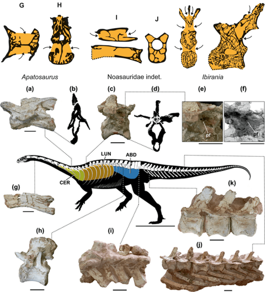 Bottom: Skeletal reconstruction of the dinosaur Macrocollum showing hypothetical position of its air sacs, along with closeups of bones that feature open spaces for air sacs to intrude. Image from Aureliano et al 2023
