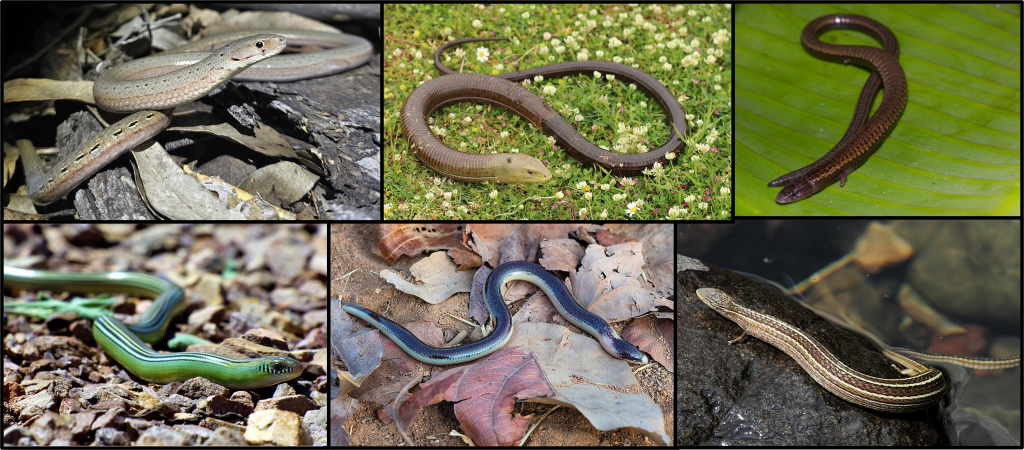 Top left: Blind skink (not a skink, Dibamidae). Image by Rafe M. Brown, CC BY 4.0