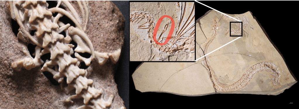 Right: Fossil of the aquatic Cretaceous snake Eupodophis with a close-up of the preserved hind limb. Image by Didier Descouens, CC BY-SA 4.0