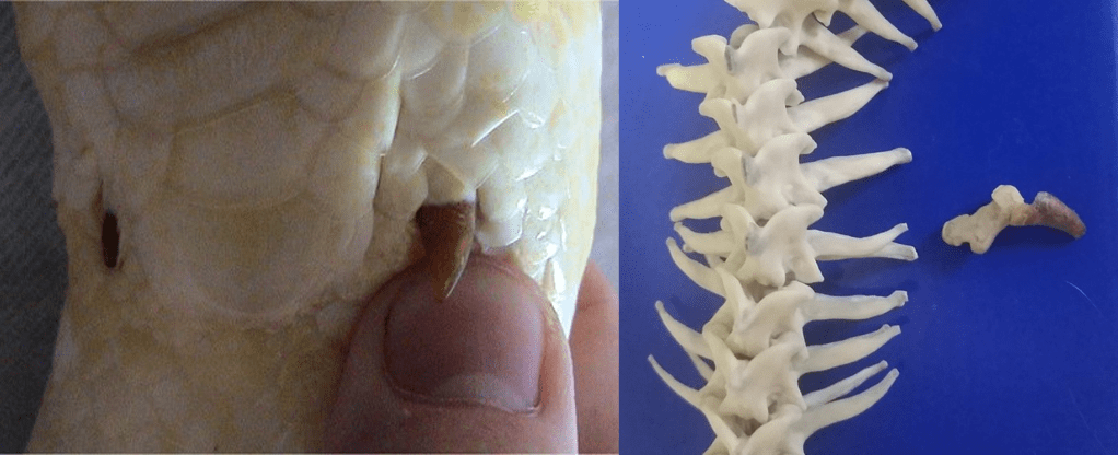 Left: Anal spurs (or pelvic spurs) of a Burmese python. Image by Dawson, CC BY-SA 2.5