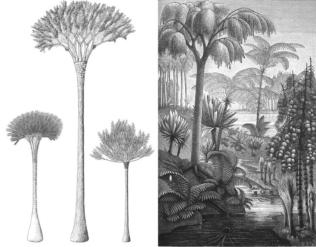 Right: Artistic depiction of a Carboniferous forest. Image from the National Library of Poland (1890)