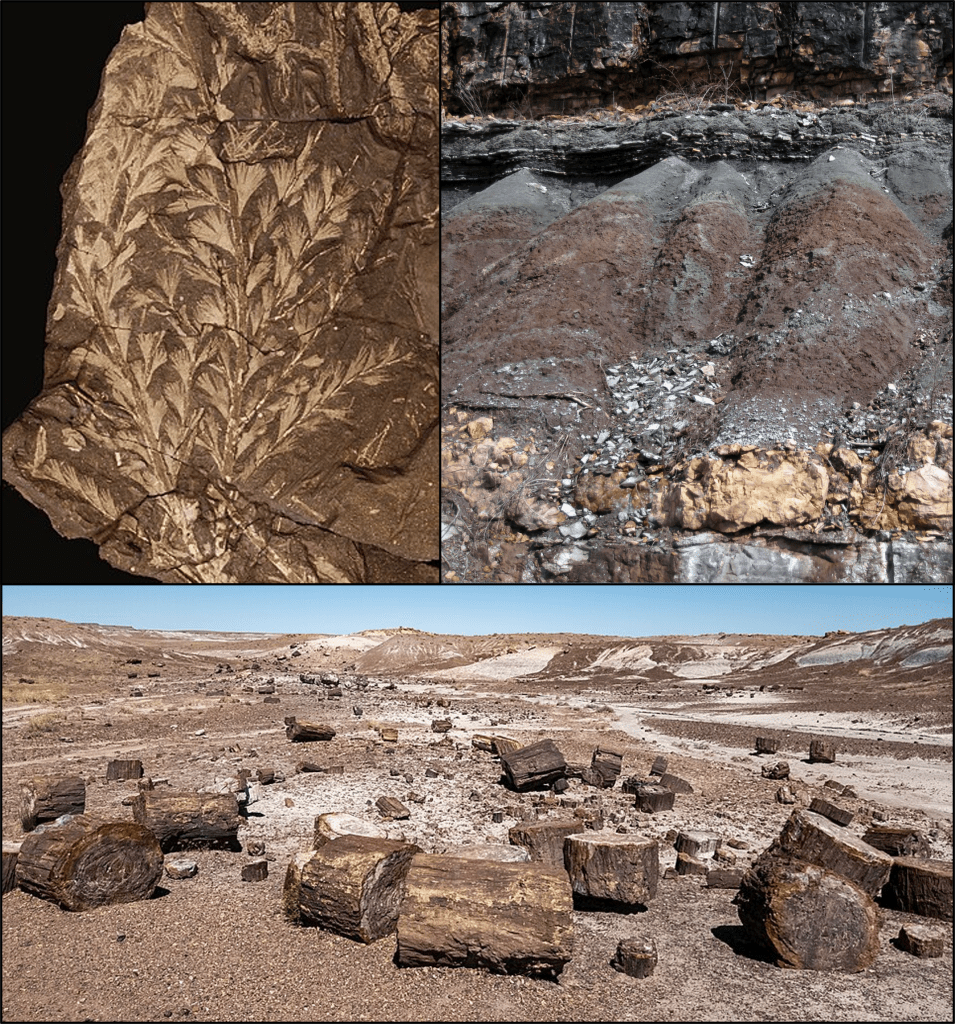 Bottom: Fossil stumps of Triassic trees at Petrified Forest National Park in Arizona. Image by Alexander Hatley, CC BY 2.0