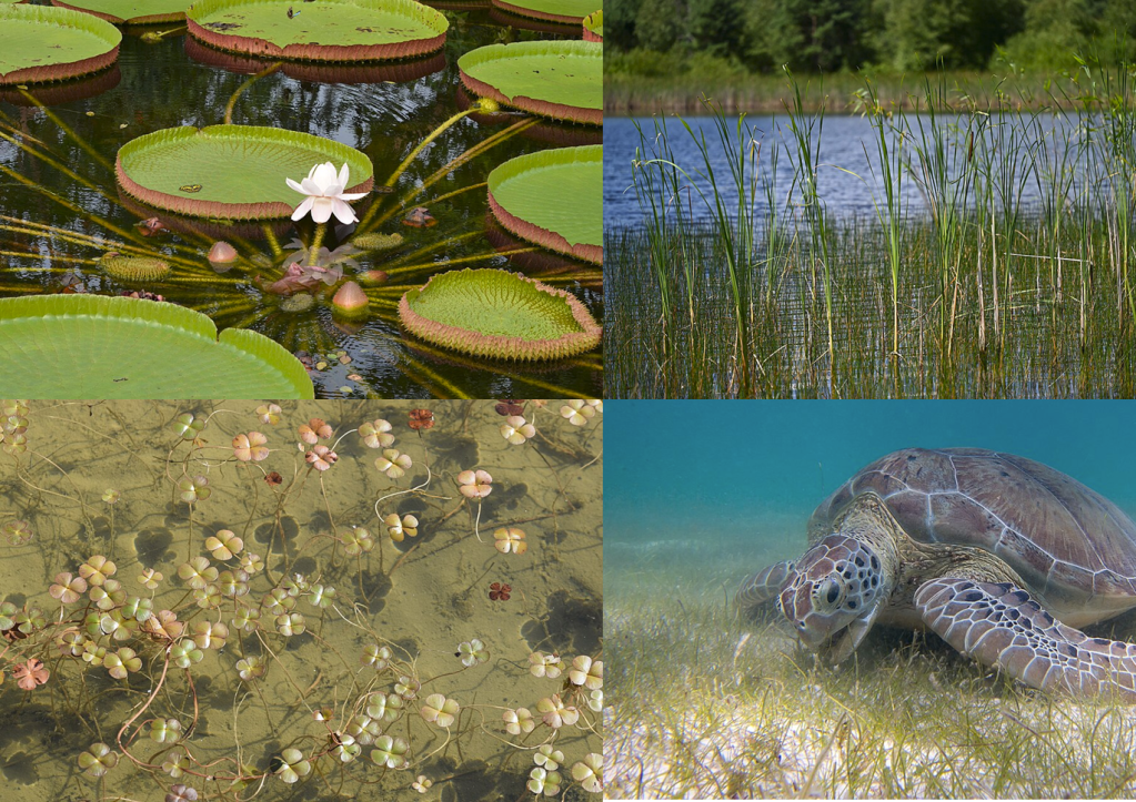 Bottom right: Seagrasses live fully submerged in ocean habitats. Image by P. Lindgren, CC BY-SA 3.0
