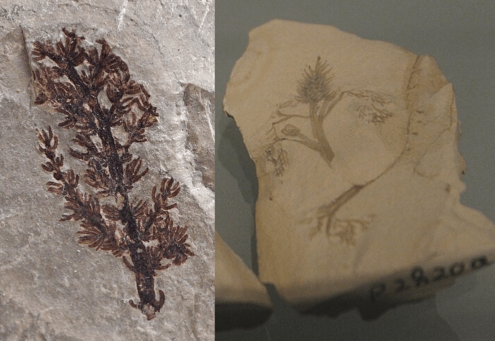 Right: Fossil of Archaefructus from Cretaceous China. Image by Jonathan Chen, CC BY-SA 4.0