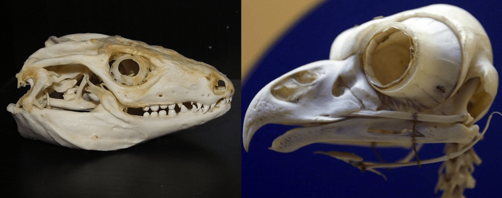 Right: Skull of a great horned owl. Image by David Stang, CC BY-SA 4.0